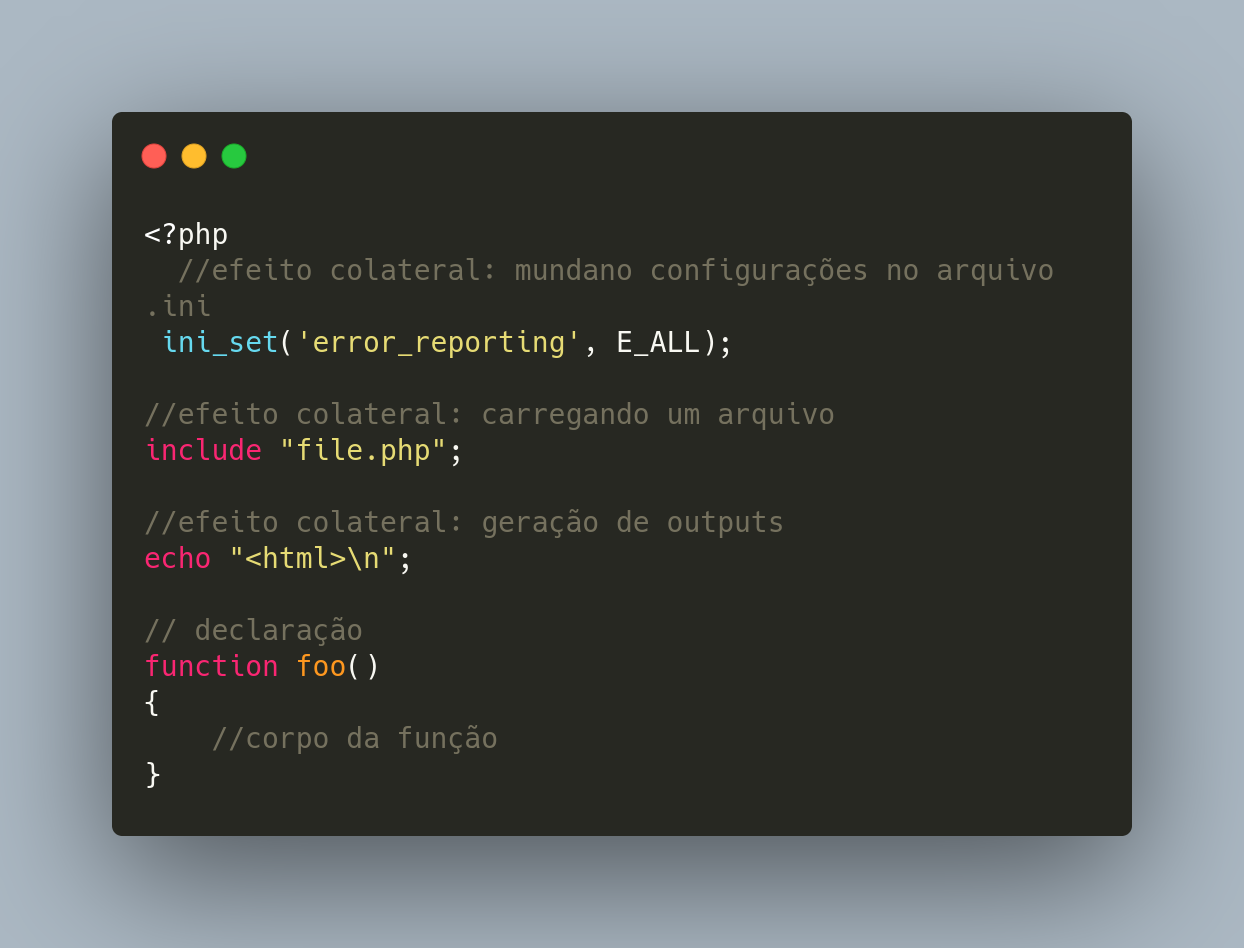 “Efeitos colaterais” incluem, mas não estão limitados a: geração de output, uso explícito do " require" ou " include", conectando à serviços externos, modificando configurações no arquivo .ini, emitindo erros ou exceções, modificando variáveis estáticas ou globais, ler e escrever em um arquivo, e por aí vai.