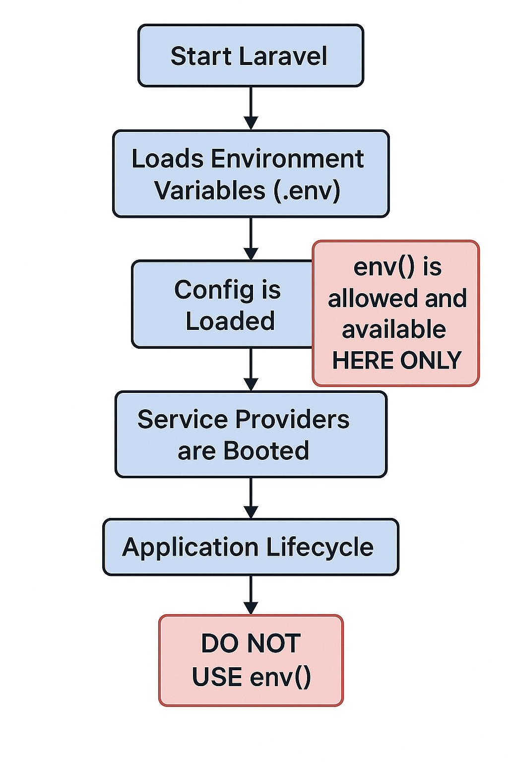 A explicação é simples: isso acontece por causa do fluxo de inicialização do Laravel. Para ajudar a visualizar, criei um diagrama que explica como esse processo funciona:
