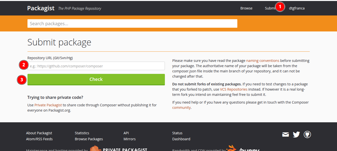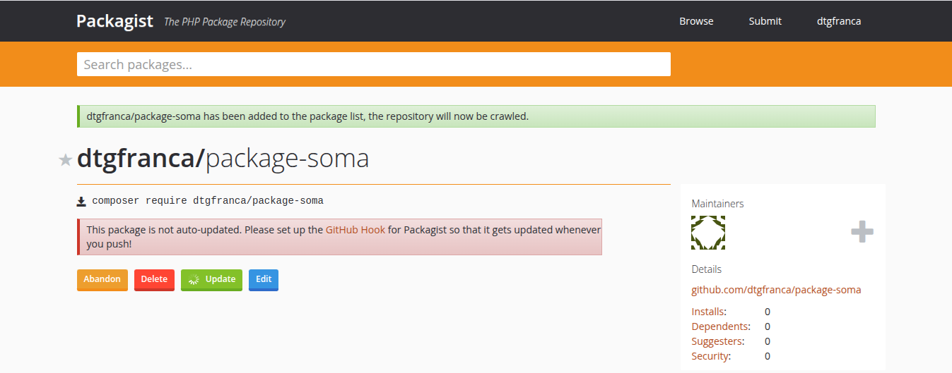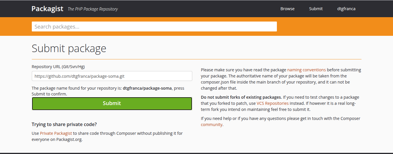 Clique em “Submit” e seu pacote já se encontra no packagist para instalação: